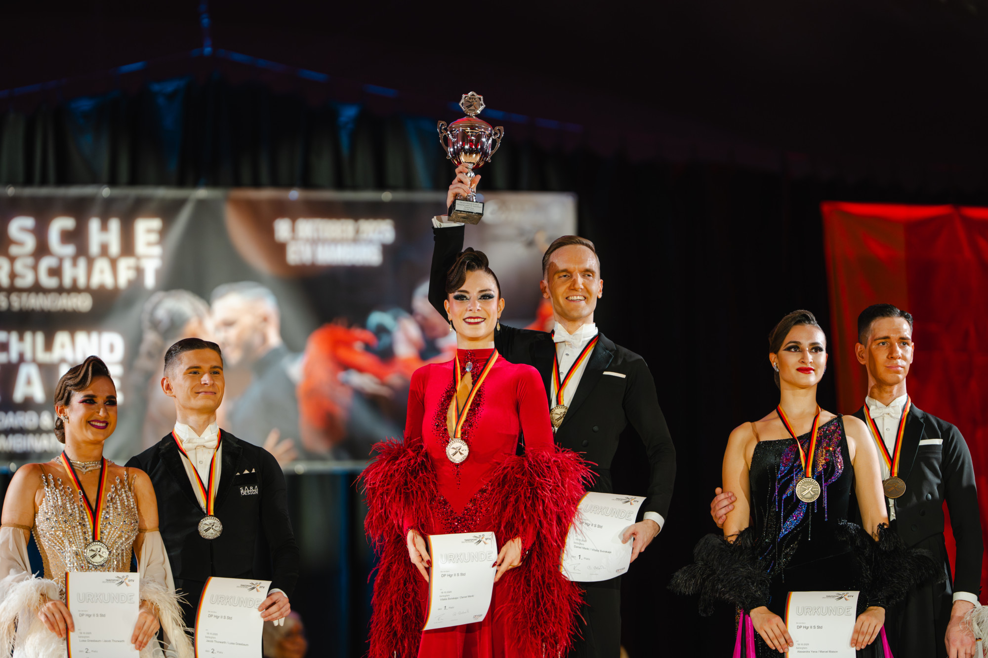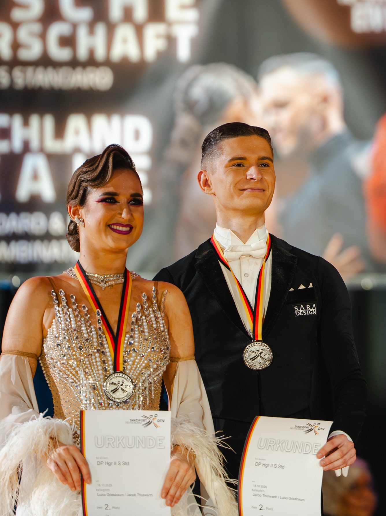 Am 18. Oktober fand in Hamburg der Deutschlandpokal der Hauptgruppe II S Standard und Latein statt, veranstaltet vom ETV Céronne Hamburg. Der Deutschlandpokal ist die inoffizielle deutsche Meisterschaft der Hauptgruppe II, also für Paare, bei denen mindestens ein Partner 28 Jahre alt ist. Ab 2026 wird das Turnier auch offiziell „Deutsche Meisterschaft“ heißen. In Standard gingen Jacob Thorwarth und Luisa Griesbaum an den Start. Sie erreichten souverän das Finale und wurden vom Wertungsgericht in allen fünf Tänzen auf den zweiten Platz gewertet: Silber für Jacob und Luisa!