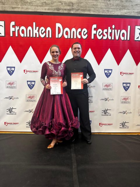 Das Franken Dance Festival 2025 ist aus TTC-Sicht erfreulich verlaufen: Tim Oliver Schmidt und Sabrina Wager siegten in der Hauptgruppe-C-Standard-Klasse. Julian Schmid und Anna Dolgov entschieden außerdem die Klassen Junioren II D und Jugend D Latein für sich. Für Julian und Anna gab’s neben den beiden Siegen auch noch ein Mal Silber und ein Mal Bronze.